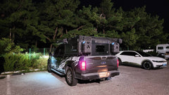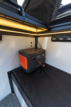 The electrical needs of your trip, in our professional opinion, are best met by purchasing a stand-alone solar generator setup or power box from Jackery (we're a dealer) or similar. These plug-and-play systems are much more trouble-free and cost effective than any hardwired setup. The lights in the Goverland Goat are wired to a generic 12v DC (cigarette lighter) plug which can be powered from your truck or from any other 12v power source!
